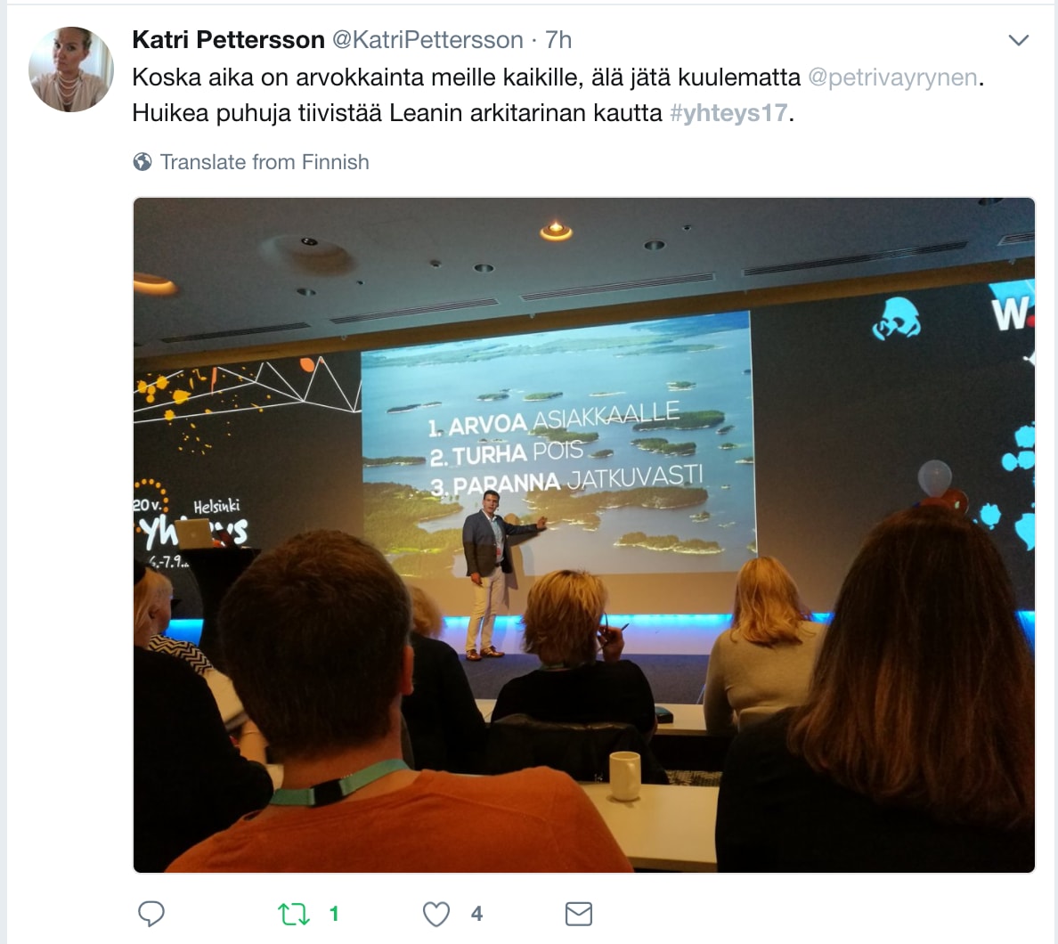 Esityksen jälkeen monet tulivat kiittämään ajatuksia herättävästä ja hyvästä esityksestä. Tuntuu hyvältä. Puhujana on usein tehnyt päiviä työtä, jotta esitys olisi mukaansatempaava, ajankohtainen ja kuulijalle merkityksellinen. Ei ole aina ihan helppoa hommaa.