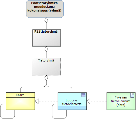 Jatkossa kannattaa ajatella, miten tietoryhmät liittyvät projektien ja palveluiden tietoelementteihin. Tietoryhmä, kuten jo nimi vihjaa, on yhteen liittyvien tietojen kokonaisuus. Esimerkiksi ”Varhaiskasvatuksen lapset” -tietoryhmä sisältää lasten henkilötiedot, osoitteet, terveystiedot ja päiväkotikäyntitiedot. Tietoryhmän sisältö voidaan kuvata käsitteiden ja niiden suhteiden avulla, eli käsitekaavion muodossa. Tietoryhmän sisältö voidaan kuvata myös loogisella tasolla, eli loogisten tietoelementtien ja niiden suhteiden avulla. Alla olevan metamallin avulla muodostuu yhtenäinen hierarkiaketju (ylhäältä alaspäin).