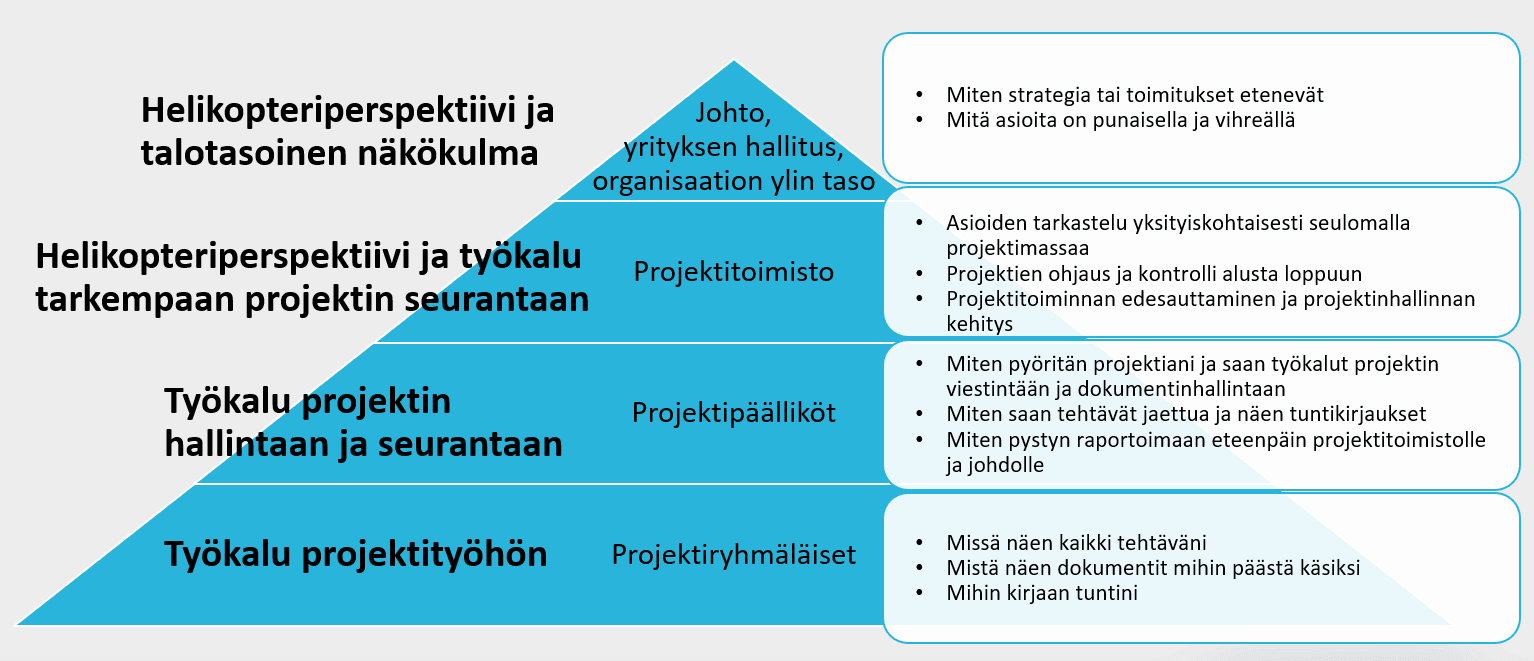 Ylin taso, organisaation johto edellyttää helikopteriperspektiiviä ja talotasoista näkökulmaa projektityöstä ohjaamaan strategisia tavoitteita. Seuraavan tason projektitoimisto tarvitsee helikopteriperspektiivin lisäksi työkalun projektien tarkempaan seurantaan ohjatakseen ja hallitakseen projektisalkun toimintaa.