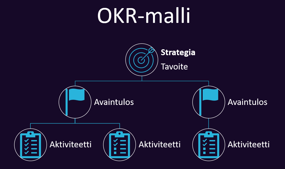 Tavoitejohtamisen ohella organisaatio voi yhtenäistää ja selkeyttää yhteisiä toimintatapoja OKR-mallin avulla, jolloin käytännön tekeminen kohti yhteistä päämäärää on yhtenäisempää.