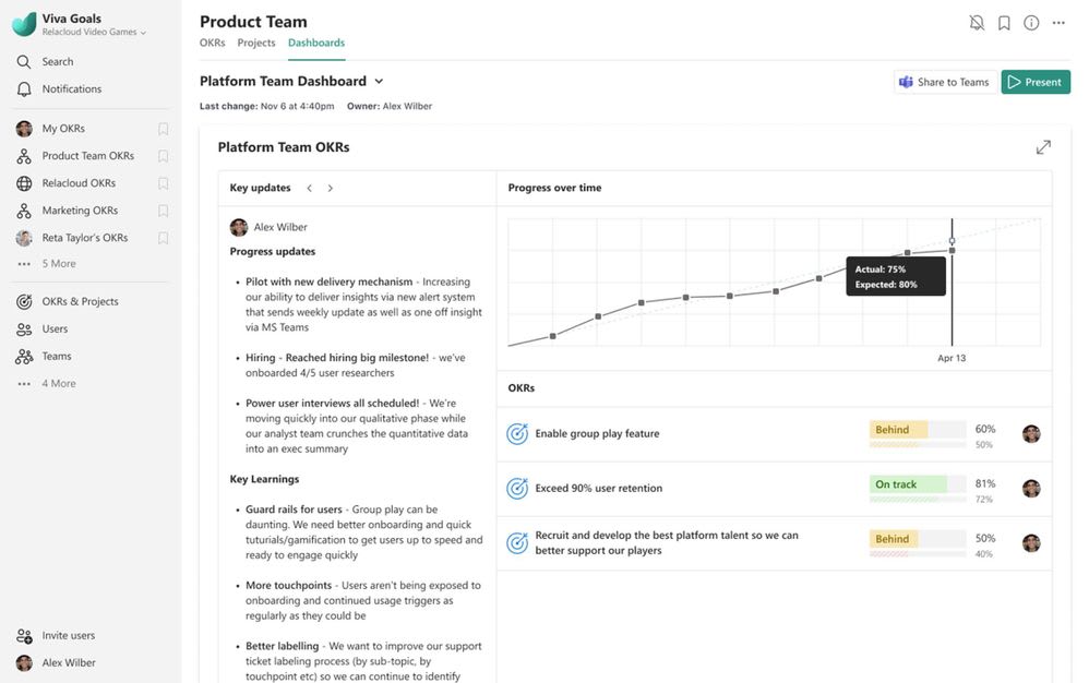 Viva Goalsin ohjausnäkymät ovat räätälöitävissä ja ne päivittyvät dynaamisesti, jolloin ne sekä tiedot OKR-tavoitteista ja avaintuloksista tarjoavat tilannetietoa reaaliaikaisesta edistymisestä kohti tavoitteita.