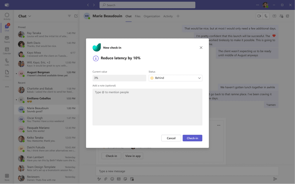 Avoin ja vuorovaikutteinen viestintä tavoitteiden ympärillä on yksi OKR-mallin keskeisiä asioita. Viva Goalsin viestilaajennus Teams-chatissa auttaa tiimejä kommunikoimaan, tekemään yhteistyötä ja kuittaamaan tavoitteita nopeasti ja helposti. Näin varmistetaan ajantasainen tieto projektien etenemisestä sekä suurien että pienien tavoitteiden saavuttamisesta.