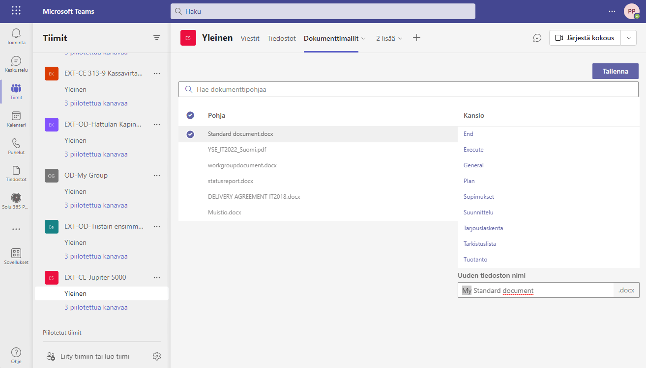- valmiit asiakirjamallit Word-, Excel-, PowerPoint- ja PDF-tiedostoina, kuten raportit tai pöytäkirjat yhdenmukaiseen työskentelyyn