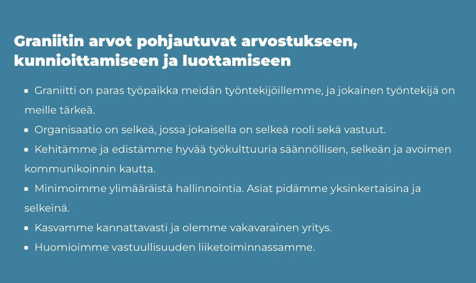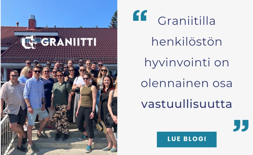 Yksi tärkeimmistä tavoitteistamme Graniitilla on kehittää ja edistää hyvää työkulttuuria säännöllisen, selkeän ja avoimen kommunikoinnin kautta. Olemme kirjanneet arvoihimme myös sen, että Graniitti on paras työpaikka meille ja teemmekin jatkuvaa työtä arvojamme peilaten. Marraskuussa 2022 halusimme ajantasaista tietoa henkilöstöltämme siitä, miten he asiat kokevat, ja teimme henkilöstöllemme työtyytyväisyyskyselyn. Henkilöstökysely on osa vastuullisuustyötämme, josta kerroimme aiemmin blogissamme.