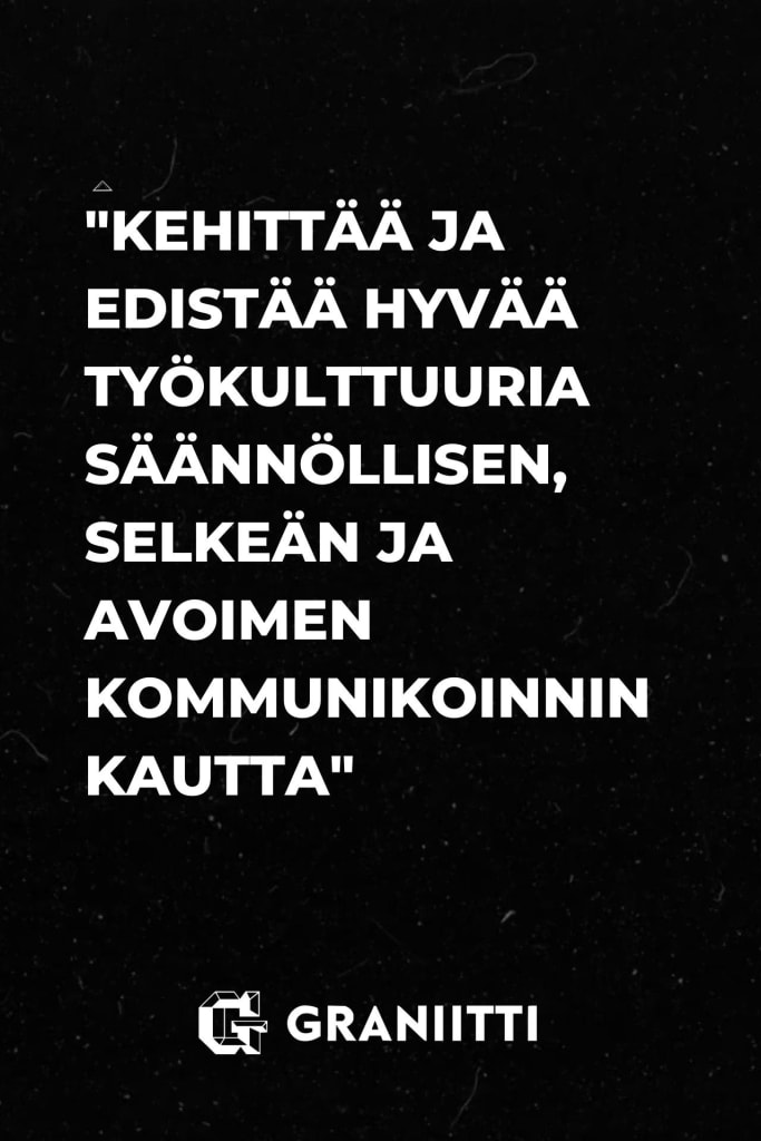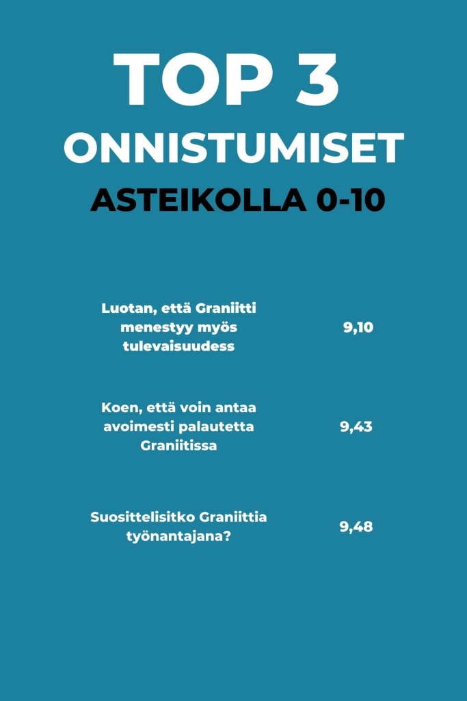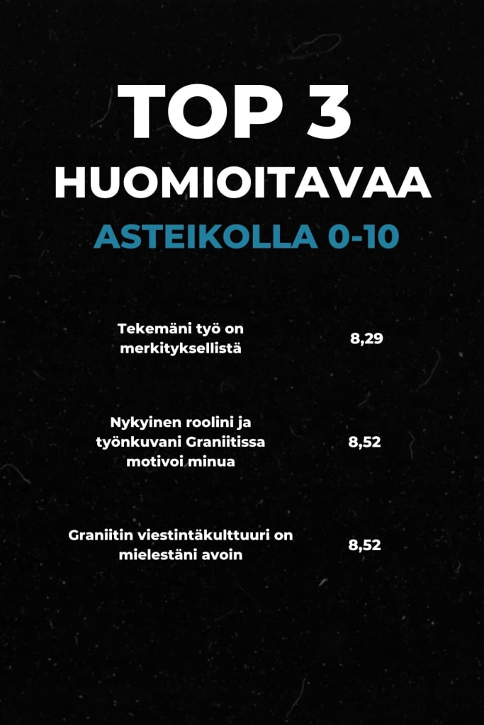 Yksi tärkeimmistä tavoitteistamme Graniitilla on kehittää ja edistää hyvää työkulttuuria säännöllisen, selkeän ja avoimen kommunikoinnin kautta. Olemme kirjanneet arvoihimme myös sen, että Graniitti on paras työpaikka meille ja teemmekin jatkuvaa työtä arvojamme peilaten. Marraskuussa 2022 halusimme ajantasaista tietoa henkilöstöltämme siitä, miten he asiat kokevat, ja teimme henkilöstöllemme työtyytyväisyyskyselyn. Henkilöstökysely on osa vastuullisuustyötämme, josta kerroimme aiemmin blogissamme.
