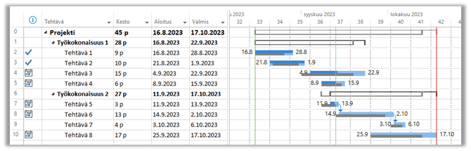 Kuva: Microsoft Project ohjelmalla piirretty Gantt-kaavio