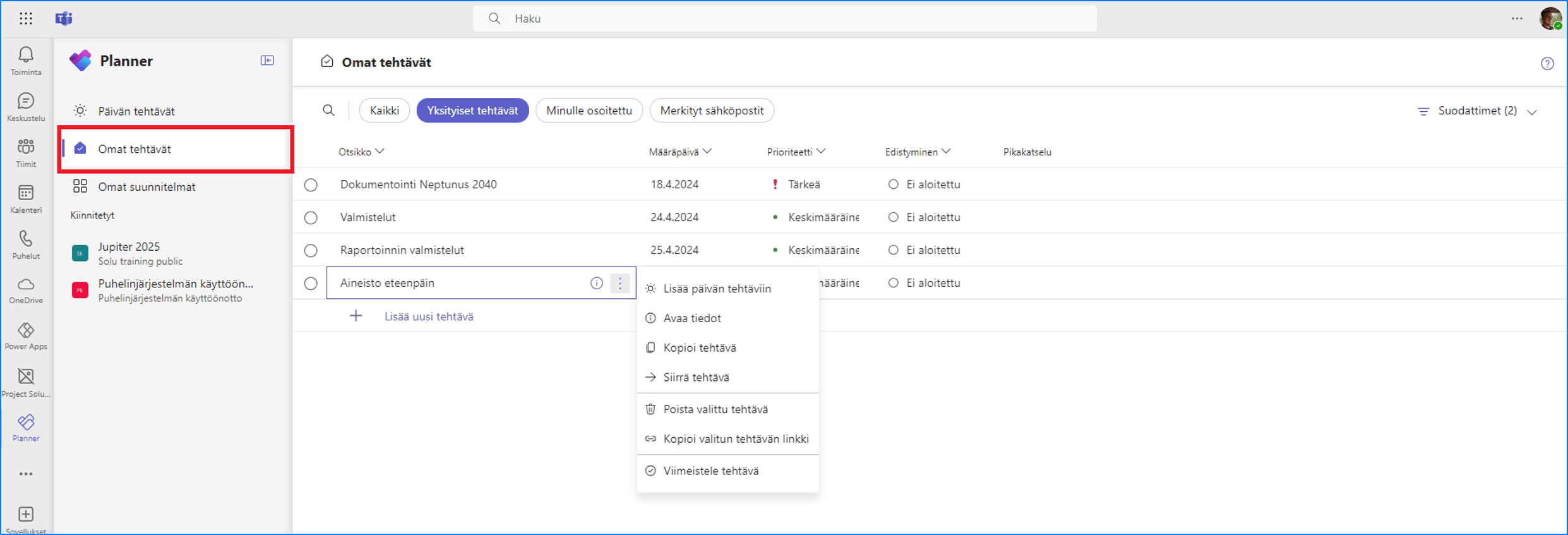 Omat tehtävät -näkymä