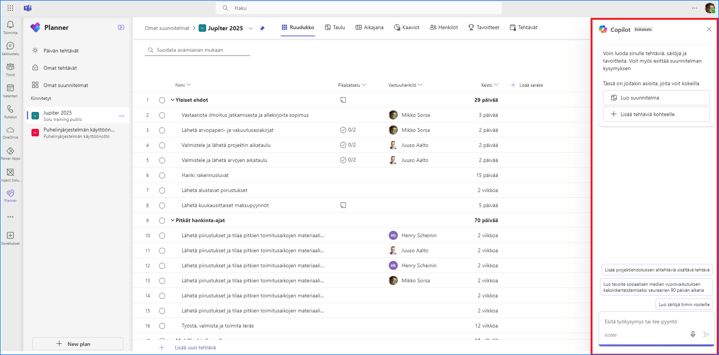 Kuvittele tilanne, jossa projektipäällikön on nopeasti luotava uusi projektiaikataulu useiden sidosryhmien kanssa. Copilot auttaa tehtävien määrittelyssä ja tarjoaa ehdotuksia projektin tehostamiseksi, varmistaen, että voit sopeutua nopeasti muuttuviin tilanteisiin.